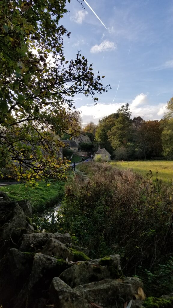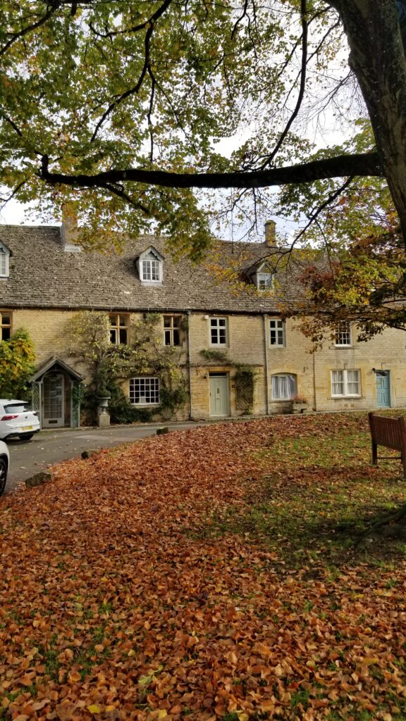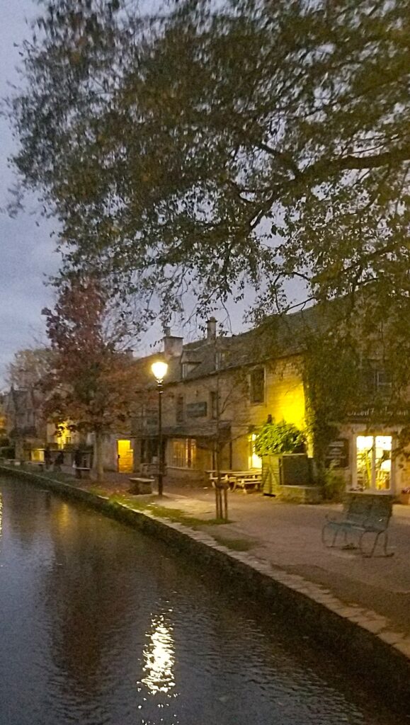 El viaje lo hicimos en octubre con lo cual los días son cortos. Llegamos a Bourton-on-the-Water cuando estaba cayendo la noche. Es otro de los pueblos más visitados de los Cotswolds, pero al atardecer conserva un ambiente tranquilo. El río Windrush atraviesa el centro de la ciudad y se puede cruzar por pequeños puentes bajos. Caminamos un rato por la ribera, viendo cómo las luces de las casas y las tiendas se reflejaban en el agua tranquila. Sin dudas, esta era la pausa que estábamos buscando para este viaje…